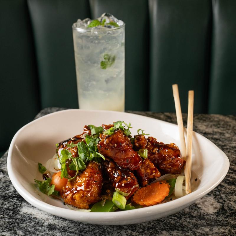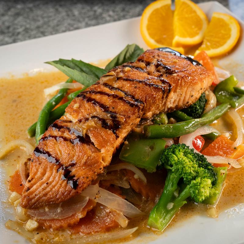Thinly sliced, grilled Flank steak, roasted vegetable medley, and traditional lime lao hot sauce.
